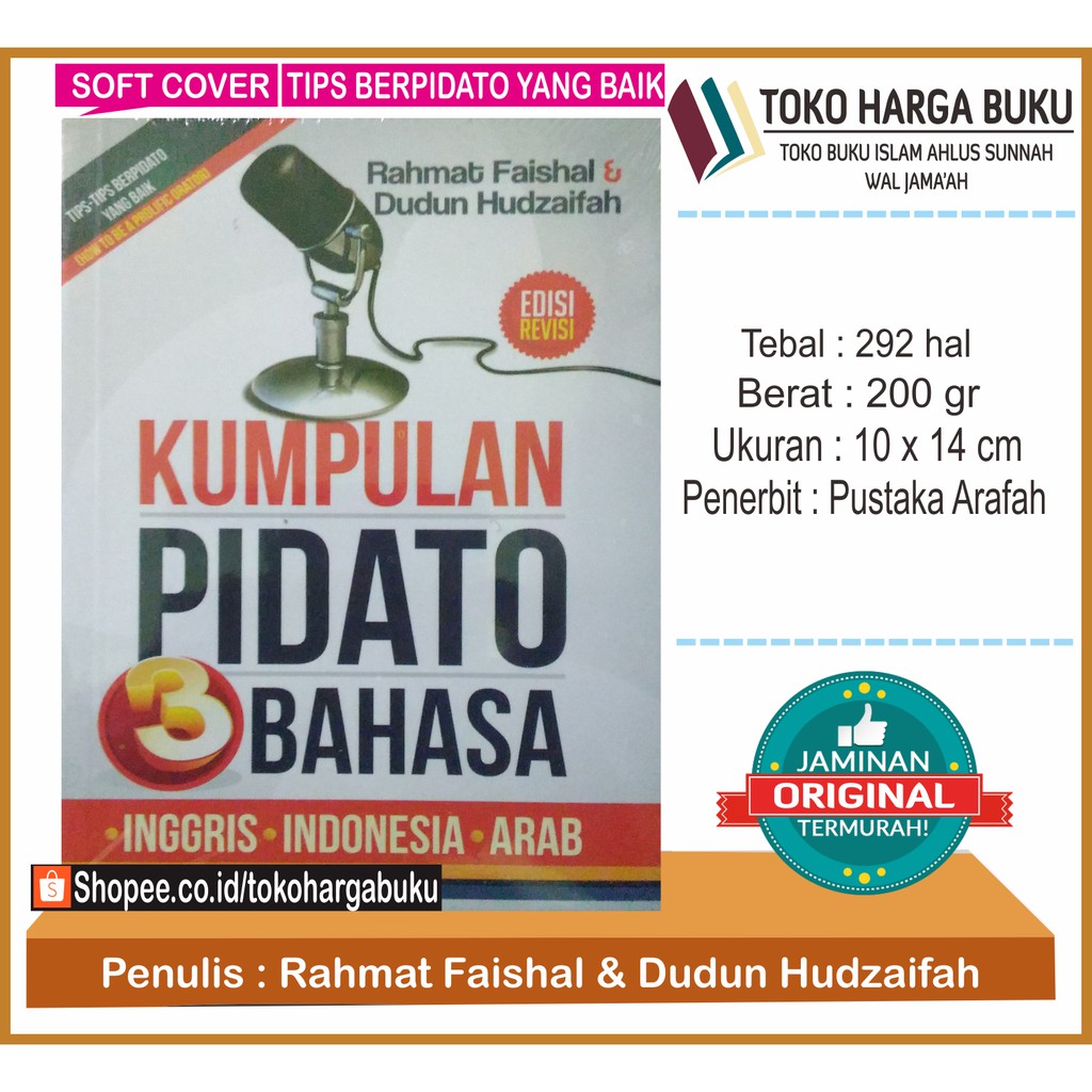 Buku kumpulan pidato 3 bahasa, penulis rahmat faishal dan dudun hudzaifah, penerbit pustaka arafah, isi 292 halaman, semi softcover, dimensi 10 x 15 cm, berat 359 gram, harga rp. Buku kumpulan pidato 3 bahasa adalah buku buku saku yang berisi kumpulan pidato menarik dalam 3 bahasa. Bahasanya ringkas dan membuat pendengar tidak merasa bosan. Bahasanya ringkas dan membuat pendengar tidak merasa bosan. Mahir pidato 3 bahasa pidato adalah salah satu sarana untuk menyampaikan dakwah.