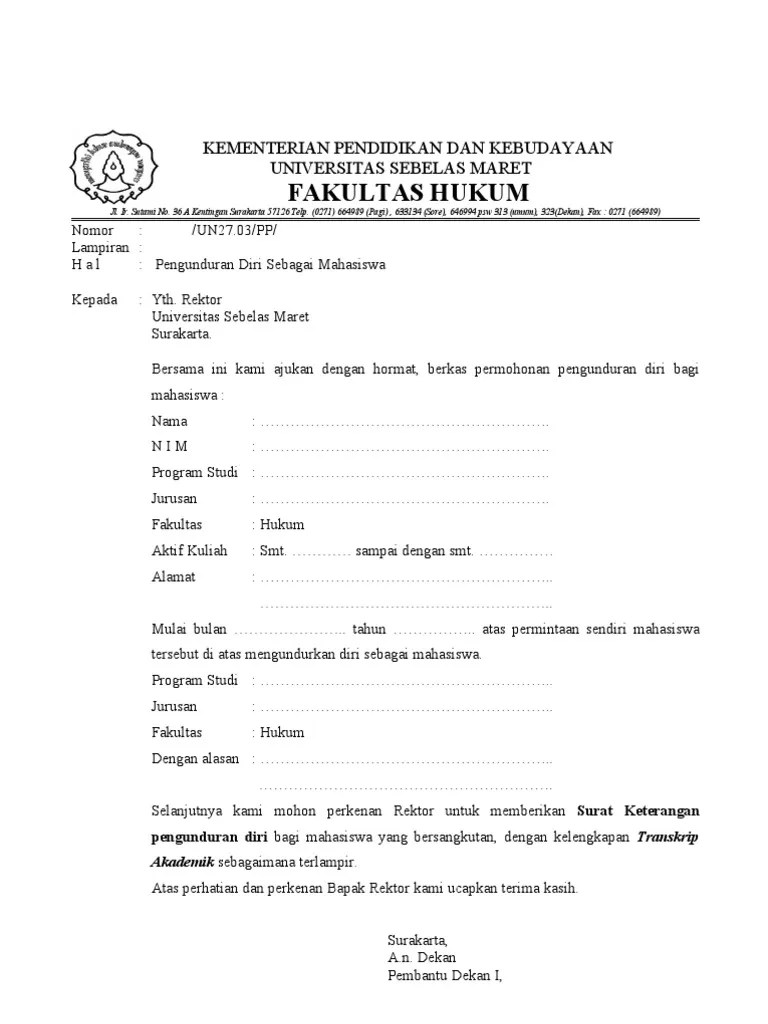 Dengan ini menyatakan mengundurkan diri sebagai mahasiswa jurusan. Pengertian surat pengunduran diri adalah surat yang dibuat untuk menyatakan pengunduran diri dari pekerjaan, sekolah, kampus, organisasi, ataupun jabatan. Dalam membuat surat pengunduran diri ada beberapa hal yang diperhatikan agar dapat. Mahasiswa mengirimkan surat permohonan pengundaran diri ke pembimbing akademik. Contoh surat pengunduran diri dari kuliah yang pertama dengan studi kasus :